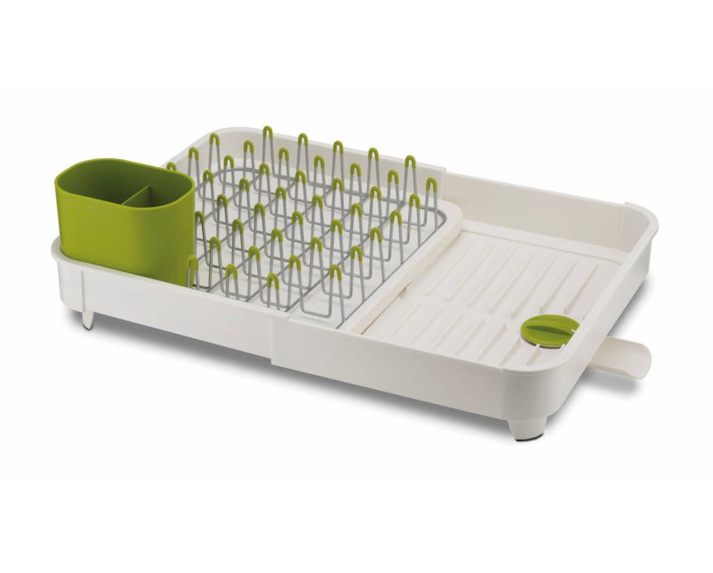 ジョセフジョセフ エクステンド ディッシュラックは、伸縮して大きさを変えられるディッシュラックです。洗い物の量やスペースに合わせて、トレイを伸縮できます。トレイをスライドするだけで、約2倍の大きさまで広げることができます。溜まった水を簡単に排水できる排水口付きなので衛生的です。つまみを回して排水の向きを変えることもできるので、ラックを置く場所が変わっても排水することができます。スチール製のラックには食器に傷がつかないよう加工が施されています。カトラリーポットはラックのどの位置にもセットできます。ラックとカトラリーポットは取り外し可能でお手入れも簡単です。トレイの底はすべり止め付きで、どんな場所でも安定して使用することができます